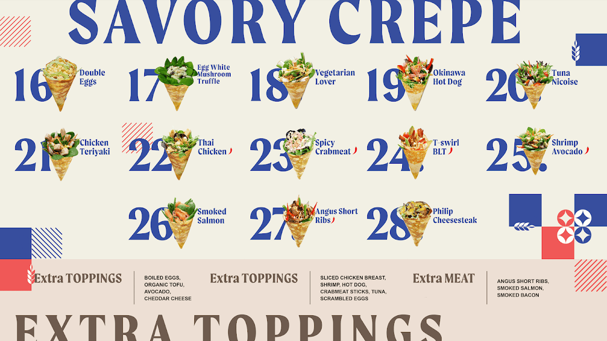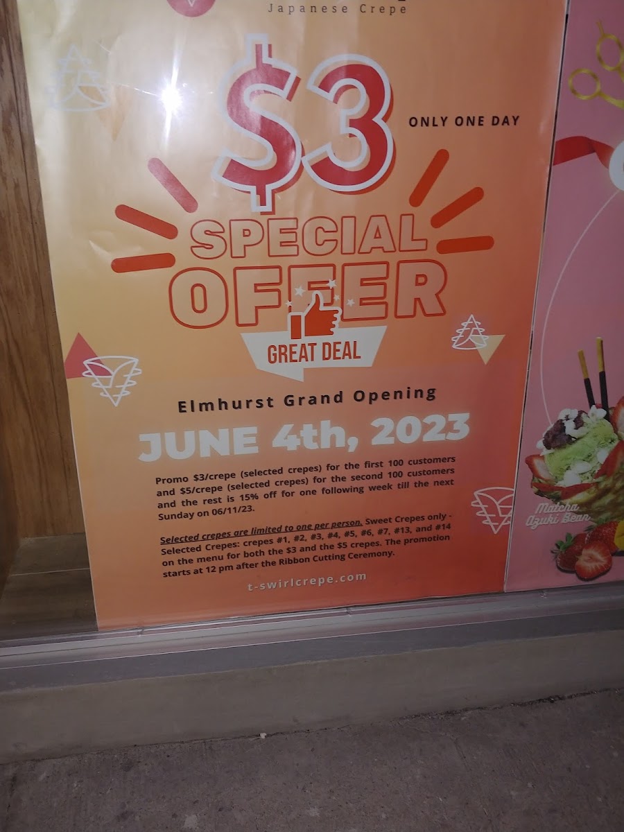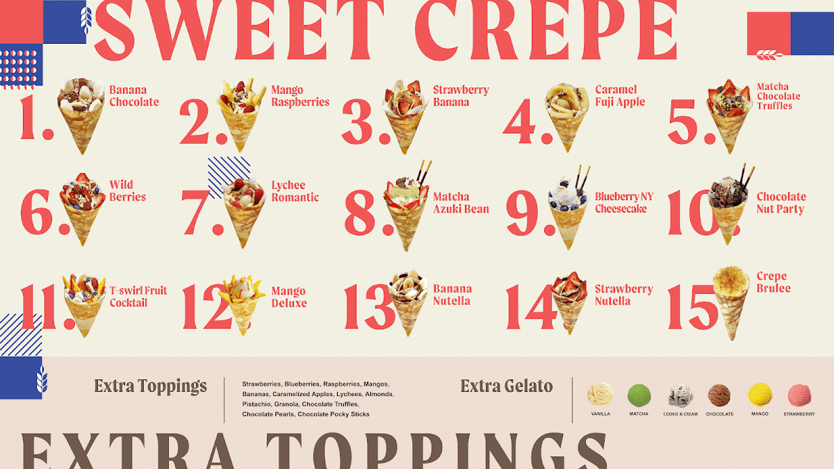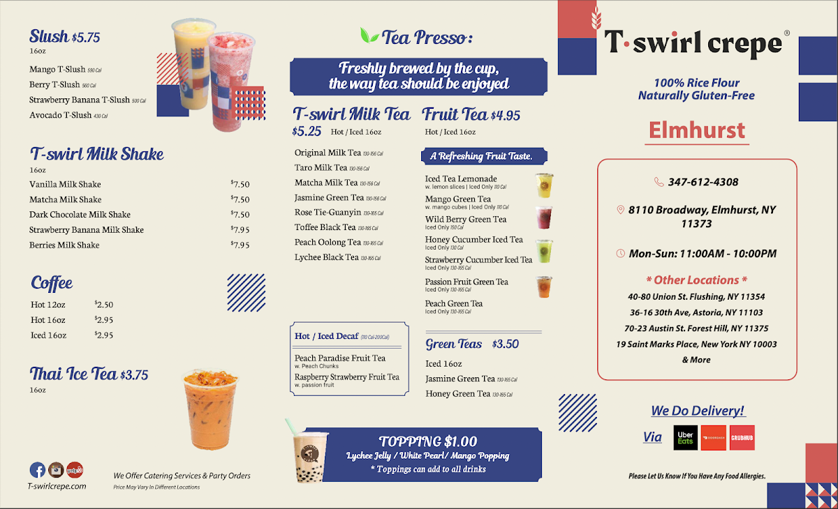 Overall, the menu at T-Swirl Crepe - Elmhurst offers a well-rounded mix of sweet and savory options that feel both creative and approachable. The newer additions like Strawberry Dubai Nutella and the Bear Madeleine Crepe Topping add a playful twist, while the lunch specials-such as Thai Chicken Lunch Specials and Shrimp Avocado Lunch Specials-provide more filling choices for midday diners. The sweet crepes, including Banana Chocolate, Mango Raspberries, and Matcha Chocolate Truffles, stand out for their classic yet indulgent combinations, while savory picks like Crispy Shrimp Tempura and Chicken Teriyaki balance the menu nicely. Desserts go beyond crepes with items like the Crepe Brulee and Original Mille Crepes, complemented by customizable treats like Small (4 Oz) or Large (8 Oz) ice cream. Drinks are equally varied, from Original Milk Tea and Taro Milk Tea to refreshing options like Mango Green Tea and Strawberry Cucumber Iced Tea, plus indulgent shakes like the Dark Chocolate Milk Shake. Even the mini crepes, such as Mini-Banana Chocolate, offer a lighter bite. While prices aren’t clearly listed, the range and creativity across categories make the menu feel diverse and satisfying, appealing to both dessert lovers and those seeking a quick savory meal.